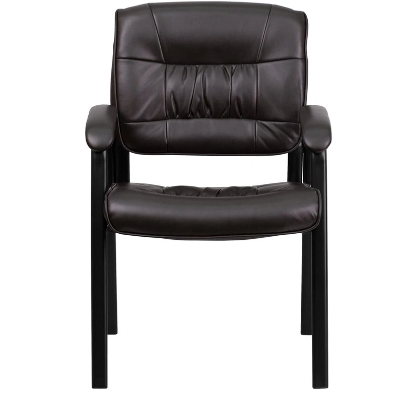 This executive side chair makes a great first impression when your customers or clients visit your place of business.It features a comfortable, contoured seat and back that are padded with 2 inches of CA117 fire retardant foam and padded arm rests, all upholstered in leather. The waterfall seat edge helps to reduce pressure and promote healthy blood flow to your legs. The sturdy metal frame will stand up to heavy use and plastic floor glides protect your floor by sliding smoothly when you need to move it.The handsome side chair is an excellent choice for your reception area or as a side chair in your office.