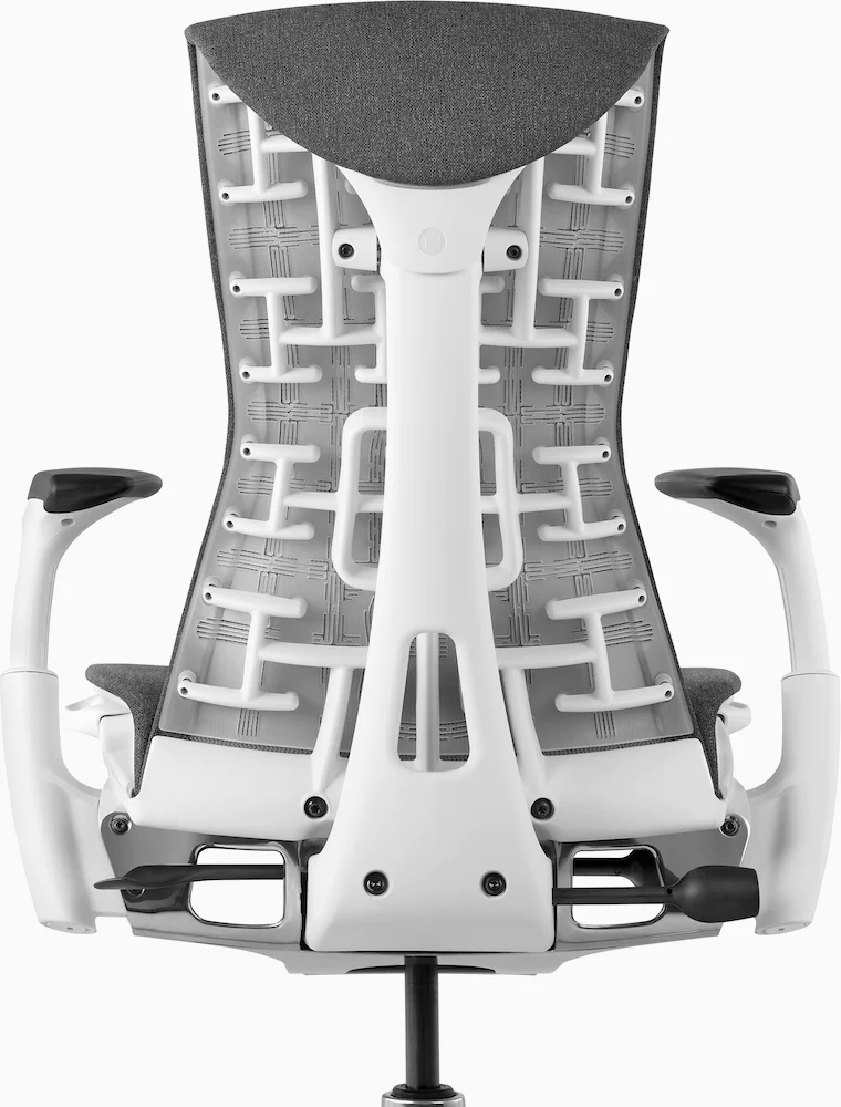 The edge of the seat is flexible, taking pressure off of your thighs. The backing of the chair, a real attention grabber with it’s beautiful and intricate design, is able to bend and lean with you, no matter what angle you’re sitting at. Most chairs either go backward or forward; the Embody Chair can go backward and forward at the same time, not to mention sideways and torqued positions. It’s meant to keep your back comfy, and users who sit in the Embody Chair for long periods of time report increased mood and productivity, as well as never having to get up to stretch their legs or move around to get their circulation going.