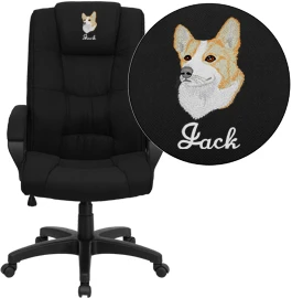 This office chair features fabric upholstery to comfortably get you through your work day or to keep you comfortable while browsing the internet. High back office chairs have backs extending to the upper back for greater support. The high back design relieves tension in the lower back, preventing long term strain. The contoured seat dissipates pressure points for greater comfort. Chair easily swivels 360 degrees to get the maximum use of your workspace without strain. The pneumatic adjustment lever will allow you to easily adjust the seat to your desired height. Personalize this chair with custom text or a logo to show off your individual style or company design.
