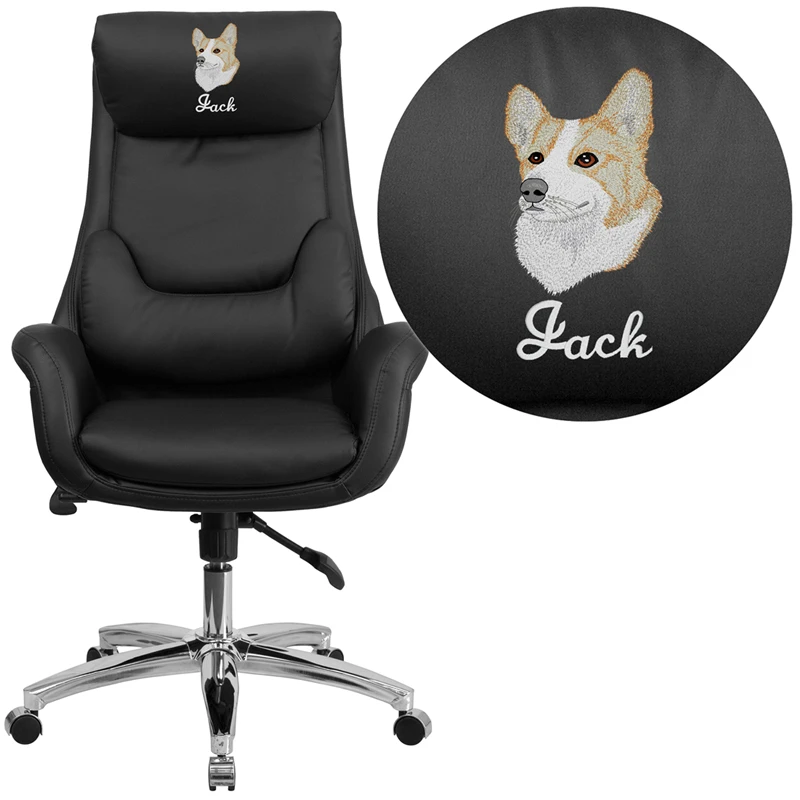This contemporary office chair features fully upholstered arms and an outer lumbar pillow that provides excellent support. Finding a comfortable chair is essential when sitting for long periods at a time. Having the support of an ergonomic office chair may help promote good posture and reduce future back problems or pain. High back office chairs have backs extending to the upper back for greater support. The high back design relieves tension in the lower back, preventing long term strain. The included headrest will take the pressure off of your neck while leaning back. The locking back angle adjustment lever changes the angle of your torso to reduce disc pressure. Chair easily swivels 360 degrees to get the maximum use of your workspace without strain. The pneumatic adjustment lever will allow you to easily adjust the seat to your desired height. The chrome base adds a stylish look to compliment a contemporary office space. Personalize this chair with custom text or a logo to show off your individual style or company design.