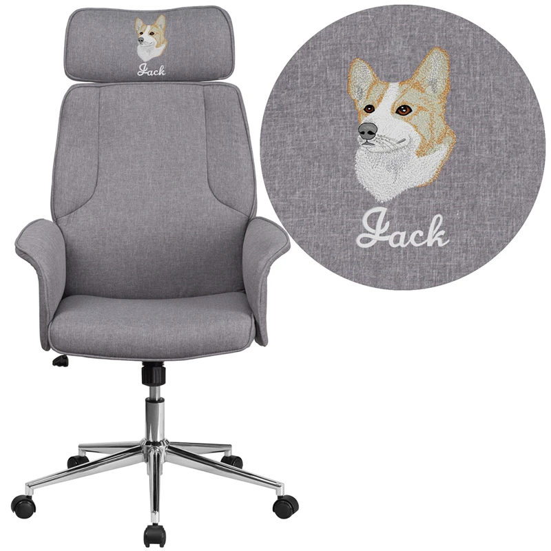 This stylishly designed chair has plenty of appeal from its curved arms to the chrome base to keep you engaged. High back office chairs have backs extending to the upper back for greater support. The high back design relieves tension in the lower back, preventing long term strain. The integrated headrest will take the pressure off of your neck while leaning back. The tilt lock mechanism offers a comfortable rocking/reclining motion. The free rein motion is great for taking a quick break from typing to answer phone calls and relax. The waterfall front seat edge removes pressure from the lower legs and improves circulation. Chair easily swivels 360 degrees to get the maximum use of your workspace without strain. The pneumatic adjustment lever will allow you to easily adjust the seat to your desired height. The chrome base adds a polished look to compliment any style of office. Personalize it with a name, logo or company name embroidered on the chair’s headrest. Select a design from our Digital Library (20,000 Images) or submit your own custom design. Choose from many available fonts and thread colors.