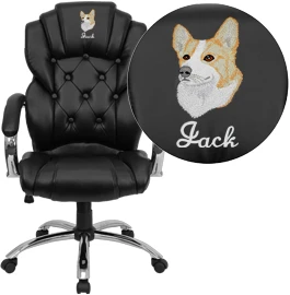 This button tufted executive office chair adds a bit of modern flair to this chair, making it a transitional style. High back office chairs have backs extending to the upper back for greater support. The high back design relieves tension in the lower back, preventing long term strain. The waterfall front seat edge removes pressure from the lower legs and improves circulation. Chair easily swivels 360 degrees to get the maximum use of your workspace without strain. The pneumatic adjustment lever will allow you to easily adjust the seat to your desired height. Personalize this chair with custom text or a logo to show off your individual style or company design.