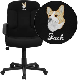 Get comfortable in this office chair while you check off the items on your ”To-Do” list.The swivel seat is padded with 5 inches of CA117 fire retardant foam and the chair is covered with fabric upholstery. Nylon armrests take pressure off your shoulders and neck. Use the tilt tension adjustment knob to increase or decrease the amount of force needed to rock and recline. Lock the position in place with the tilt lock mechanism. Raise and lower your seat height with the pneumatic seat height adjustment lever, conveniently located below the seat. The heavy-duty, nylon base with dual wheel casters makes it easy to roll across the floor.When you want a great home or office chair, offering comfort, style and functionality, this attractive office chair is a great choice. Personalize it with a name, logo or company name embroidered on the chair’s back. Select a design from our Digital Library (20,000 Images) or submit your own custom design. Choose from many available fonts and thread colors.