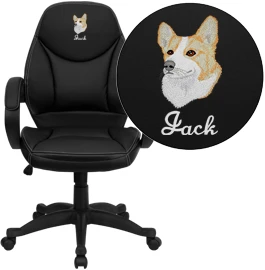 This stylishly designed office chair features leather upholstery with white stitch surrounding to comfortably get you through your work day. This chair features an ergonomically contoured back and seat and arms that are comfortably padded. A mid-back office chair offers support to the mid-to-upper back region. The waterfall front seat edge removes pressure from the lower legs and improves circulation. Chair easily swivels 360 degrees to get the maximum use of your workspace without strain. The pneumatic adjustment lever will allow you to easily adjust the seat to your desired height. Personalize this chair with custom text or a logo to show off your individual style or company design.