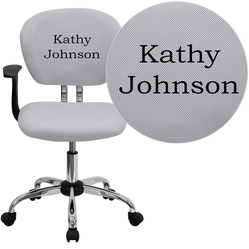 This mesh task chair supports you in comfort when you’re working long hours to get the job done. Personalize it with a name or other text embroidered on the chair’s back. Choose from many available fonts and thread colors.It features a mid-back design to support your mid-to-upper back region. The swivel seat and back are padded with 2 inches of CA117 fire retardant foam and covered in mesh upholstery. Raise and lower the seat using the pneumatic seat height adjustment lever, conveniently located under the seat. A heavy-duty, chrome base with dual wheel casters makes it easy to roll across the floor.Whether you’re sitting in class, studying for a final exam or working to beat a tight deadline, this stylish chair will keep you cool and comfortable throughout your busy day.