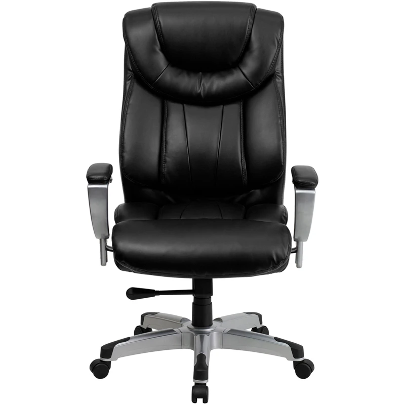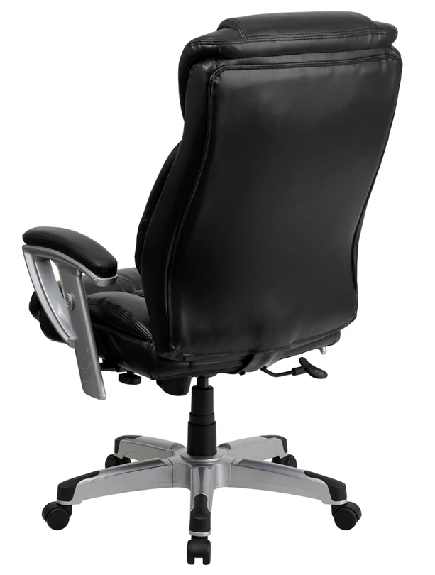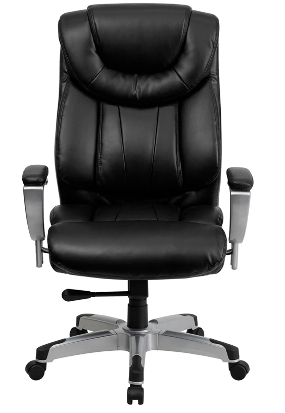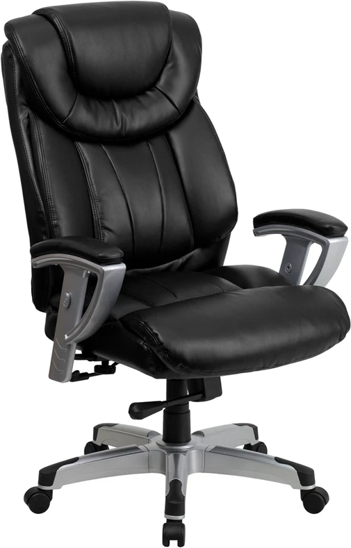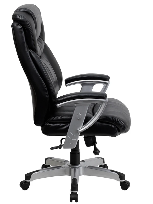 Finding a comfortable chair is essential when sitting for long periods at a time. Big & Tall office chairs are designed to accommodate larger and taller body types. This chair has been tested to hold a capacity of up to 400 lbs., offering a broader seat and back width. High back office chairs have backs extending to the upper back for greater support. The high back design relieves tension in the lower back, preventing long term strain. This office chair features plenty of thick, plush padding to provide greater support. The waterfall front seat edge removes pressure from the lower legs and improves circulation. Chair easily swivels 360 degrees to get the maximum use of your workspace without strain. The pneumatic adjustment lever will allow you to easily adjust the seat to your desired height. The height and width adjustable armrests take the pressure off the shoulders and the neck, which minimizes the risk of pain. The silver nylon capped metal base with black caps prevents feet from slipping when resting on chairs base.