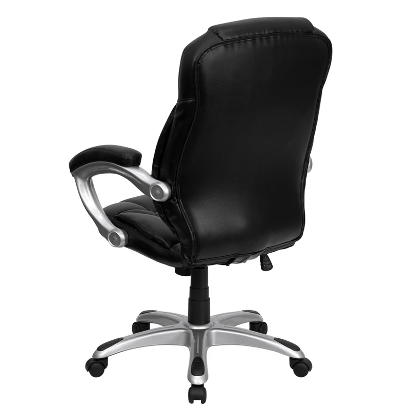 This gracefully designed chair features leather upholstery to comfortably get you through your work day or to keep you comfortable while browsing the internet. This chair features an ergonomically contoured back and seat and arms that are comfortably padded. High back office chairs have backs extending to the upper back for greater support. The high back design relieves tension in the lower back, preventing long term strain. The contoured seat dissipates pressure points for greater comfort. The waterfall front seat edge removes pressure from the lower legs and improves circulation. Chair easily swivels 360 degrees to get the maximum use of your workspace without strain. The pneumatic adjustment lever will allow you to easily adjust the seat to your desired height. The titanium nylon base with black caps prevents feet from slipping when resting on chairs base.