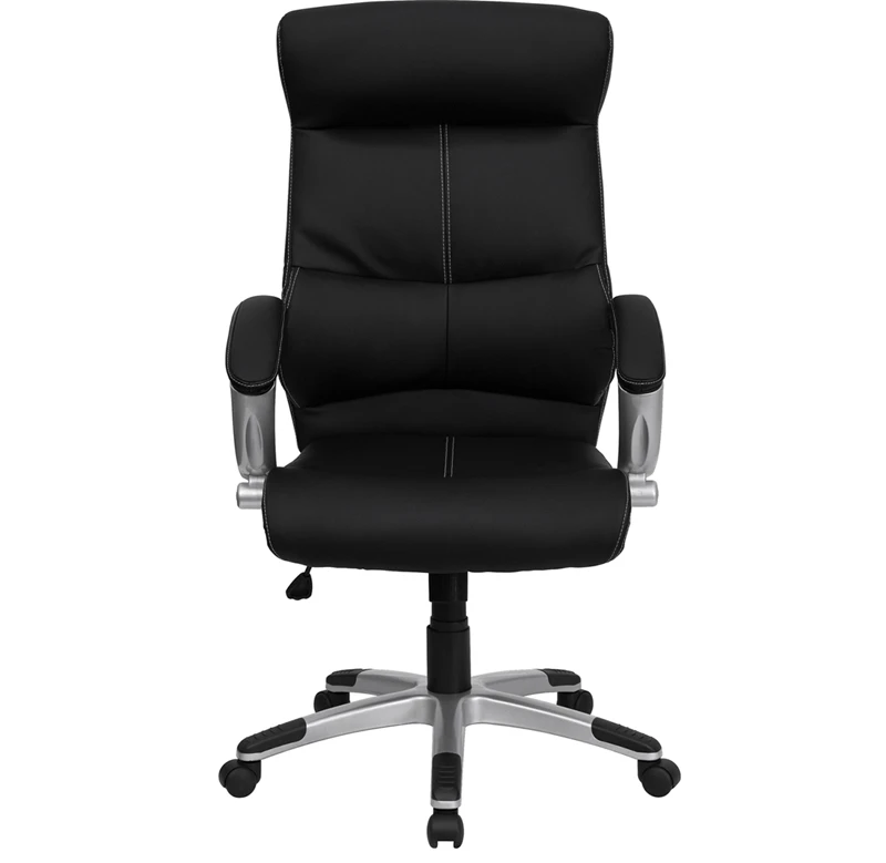 This stylishly designed office chair features leather upholstery with white stitch accents to comfortably get you through your work day. High back office chairs have backs extending to the upper back for greater support. The high back design relieves tension in the lower back, preventing long term strain. The generously padded headrest will take the pressure off of your neck while leaning back. Chair easily swivels 360 degrees to get the maximum use of your workspace without strain. The pneumatic adjustment lever will allow you to easily adjust the seat to your desired height. The silver nylon base with black caps prevents feet from slipping when resting on chairs base.