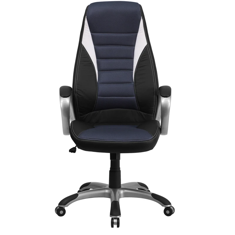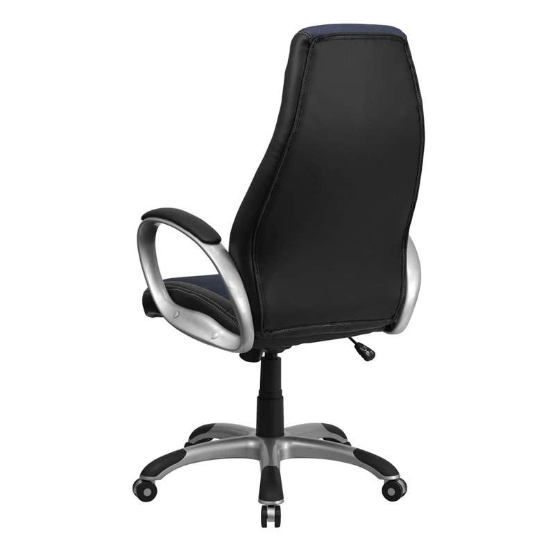 If you’re looking for a comfortable chair than you’ve found it in this contemporary office chair that features an ergonomically designed seat and back. This chair is attractively designed with blue mesh inserts in the back and seat with vinyl surrounding. Finding a comfortable chair is essential when sitting for long periods at a time. Having the support of an ergonomic office chair may help promote good posture and reduce future back problems or pain. High back office chairs have backs extending to the upper back for greater support. The high back design relieves tension in the lower back, preventing long term strain. The waterfall front seat edge removes pressure from the lower legs and improves circulation. Chair easily swivels 360 degrees to get the maximum use of your workspace without strain. The pneumatic adjustment lever will allow you to easily adjust the seat to your desired height. The silver nylon base with black caps prevents feet from slipping when resting on chairs base.