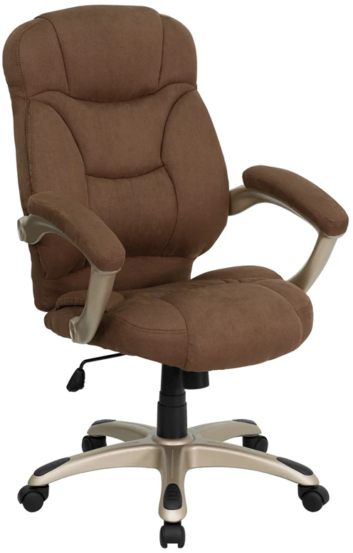 This gracefully designed chair features microfiber upholstery to comfortably get you through your work day or to keep you comfortable while browsing the internet. This chair features an ergonomically contoured back and seat and arms that are comfortably padded. High back office chairs have backs extending to the upper back for greater support. The high back design relieves tension in the lower back, preventing long term strain. The contoured seat dissipates pressure points for greater comfort. The waterfall front seat edge removes pressure from the lower legs and improves circulation. Chair easily swivels 360 degrees to get the maximum use of your workspace without strain. The pneumatic adjustment lever will allow you to easily adjust the seat to your desired height. The titanium nylon base with black caps prevents feet from slipping when resting on chairs base.