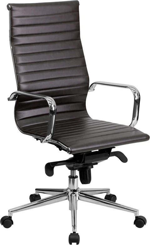 This elegant conference chair will give your home, office or conference room an upscale, minimalist look.It’s upholstered in leather and has polished aluminum arms and frame with an integrated coat hanger bar. The high back chair features a ribbed and foam molded, swivel seat and back, and built-in lumbar support. The seat and back are padded with CA117 fire retardant foam. A dual paddle control mechanism under the seat gives you the adjustment options you need for a custom fit. Turn the tilt tension adjustment knob to increase or decrease the amount of force needed to rock and recline. Lock the position in place with the locking knee-tilt control mechanism. Raise and lower your seat height using the pneumatic seat height adjustment lever, conveniently located under the seat. A polished aluminum base with dual wheel casters makes it easy to roll across the floor.The Black Leather Conference Chair is a great choice for your work or home office.