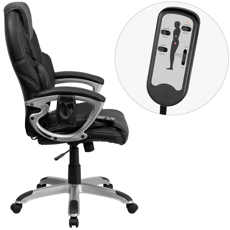 Enjoy a relaxing massage in the comfort of your own office with this incredibly comfortable Massaging Executive Office Chair. The included remote has a variable slider intensity mode to get to your desired comfort level and has a designated side pocket when not in use. Finding a comfortable chair is essential when sitting for long periods at a time. Having the support of an ergonomic office chair may help promote good posture and reduce future back problems or pain. High back office chairs have backs extending to the upper back for greater support. The high back design relieves tension in the lower back, preventing long term strain. The waterfall front seat edge removes pressure from the lower legs and improves circulation. Chair easily swivels 360 degrees to get the maximum use of your workspace without strain. The pneumatic adjustment lever will allow you to easily adjust the seat to your desired height.