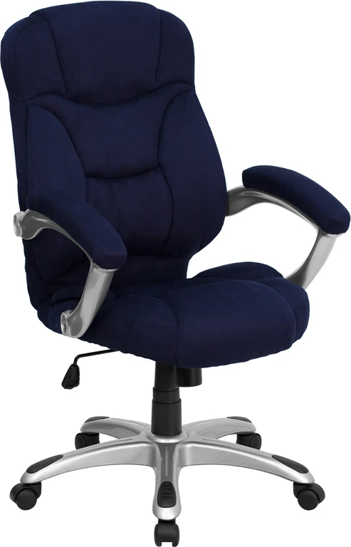 This gracefully designed chair features microfiber upholstery to comfortably get you through your work day or to keep you comfortable while browsing the internet. This chair features an ergonomically contoured back and seat and arms that are comfortably padded. High back office chairs have backs extending to the upper back for greater support. The high back design relieves tension in the lower back, preventing long term strain. The contoured seat dissipates pressure points for greater comfort. The waterfall front seat edge removes pressure from the lower legs and improves circulation. Chair easily swivels 360 degrees to get the maximum use of your workspace without strain. The pneumatic adjustment lever will allow you to easily adjust the seat to your desired height. The titanium nylon base with black caps prevents feet from slipping when resting on chairs base.