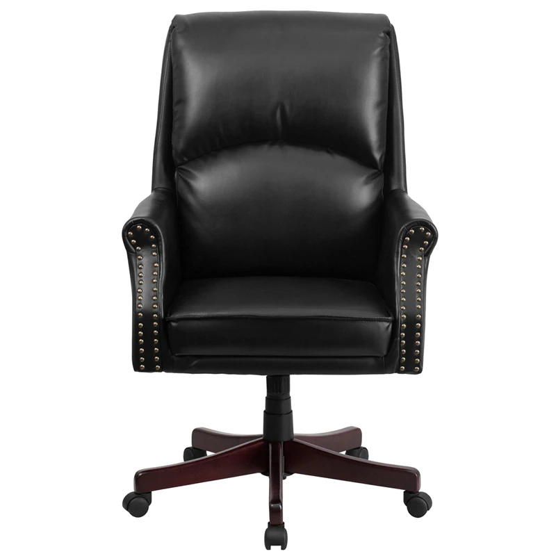 This luxurious traditional chair features soft Black Leather upholstery and brass nail accents that trim the rolled arms. Having the support of an ergonomic office chair may help promote good posture and reduce future back problems or pain. High back office chairs have backs extending to the upper back for greater support. The high back design relieves tension in the lower back, preventing long term strain. The plush pillow back cushion provides excellent support, allowing your back to rest comfortably. Chair easily swivels 360 degrees to get the maximum use of your workspace without strain. The pneumatic adjustment lever will allow you to easily adjust the seat to your desired height. The mahogany wood base adds to the charm of a traditional appearance.