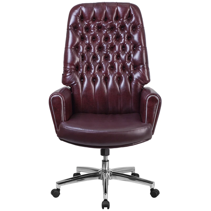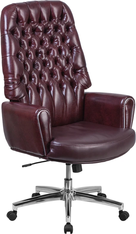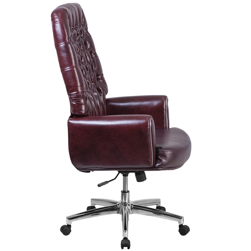 This button tufted executive office chair combines old world craftsmanship with modern seating principles, giving you a chair that feels as good as it looks. High back office chairs have backs extending to the upper back for greater support. The high back design relieves tension in the lower back, preventing long term strain. The tilt lock mechanism offers a comfortable rocking/reclining motion. The free rein motion is great for taking a quick break from typing to answer phone calls and relax. Chair easily swivels 360 degrees to get the maximum use of your workspace without strain. The pneumatic adjustment lever will allow you to easily adjust the seat to your desired height. The arms are adorned with a silver trim welt. The heavy duty chrome base adds a more modern flair.