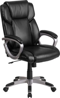 This Executive Leather Office Chair offers a stylish appearance as well as comfort. The mid-back design provides support to the mid-to-upper back region. Turn the tilt tension adjustment knob to increase or decrease the amount of force needed to rock or recline. Lock the seat in place with the tilt lock mechanism. The waterfall front seat edge removes pressure from the lower legs and improves circulation. Chair easily swivels 360 degrees to get the maximum use of your workspace without strain. The pneumatic adjustment lever will allow you to easily adjust the seat to your desired height. The silver nylon base with black caps prevents feet from slipping when resting on chairs base. This chair will make for a great work or home office chair.