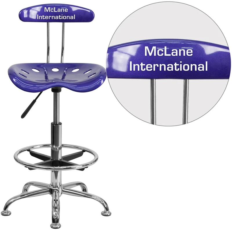 The Drafting Stool with Tractor Seat is a versatile option that’s sized right for the workbench in your garage, stand-up desk in your office and the island in your kitchen.The back and swivel seat are made from high-density polymer for durability and a sleek, shiny finish. Easily raise or lower the height of this drafting chair using the pneumatic adjustment lever, conveniently located under the seat. Plastic floor glides protect your floor by sliding smoothly when you need to move it and the heavy-duty, chrome base and foot ring complement the stool’s modern design. Personalize it with a name, nickname or company name on the chair’s back with durable UV resistant vinyl lettering. Choose from many available fonts and vinyl colors.This contemporary drafting stool with comfort molded tractor seat combines leading edge style with great functionality.