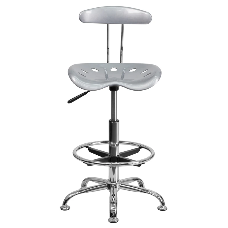 The Drafting Stool with Tractor Seat is a versatile option that’s sized right for the workbench in your garage, stand-up desk in your office and the island in your kitchen.The back and swivel seat are made from high-density polymer for durability and a sleek, shiny finish. Easily raise or lower the height of this drafting chair using the pneumatic adjustment lever, conveniently located under the seat. Plastic floor glides protect your floor by sliding smoothly when you need to move it and the heavy-duty, chrome base and foot ring complement the stool’s modern design.This contemporary drafting stool with comfort molded tractor seat combines leading edge style with great functionality.